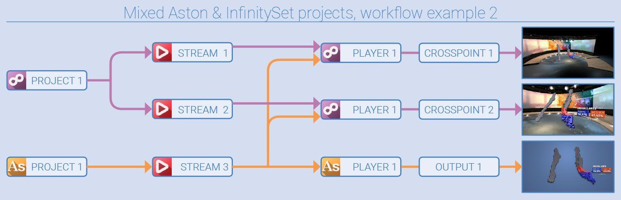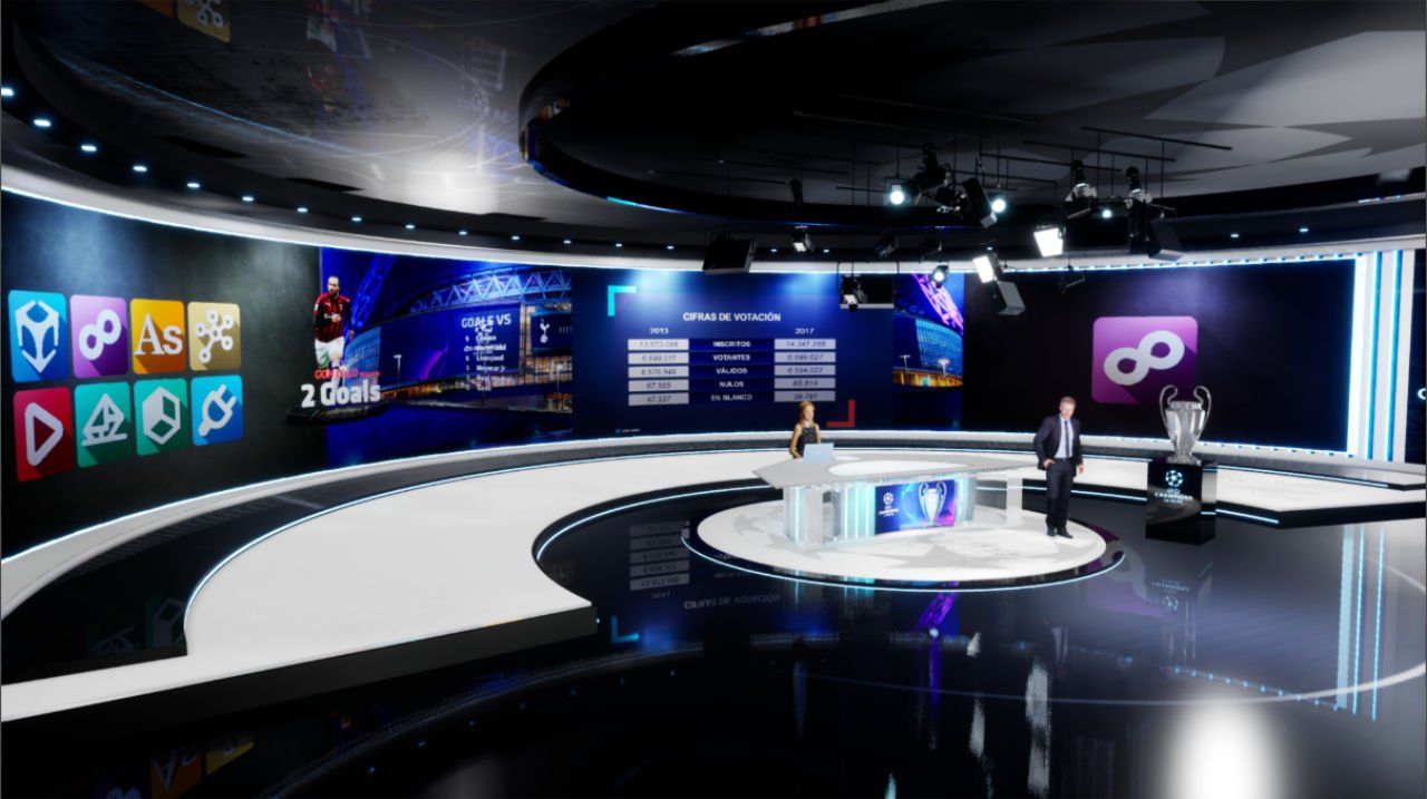 Aston-Grafiken und -Projekte, einschließlich der Animationslogik und -struktur, lassen sich nahtlos in InfinitySet integrieren und verbessern so die Erstellung, Verwaltung und Nutzung von Grafikinhalten für Augmented und Mixed Reality, die durch die Verwendung solcher kontextbezogener datengesteuerter Grafiken ebenfalls verbessert werden können.