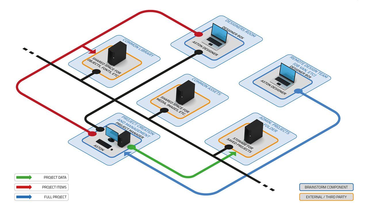 Aston lässt sich nahtlos in kollaborative Workflow-Umgebungen integrieren und ermöglicht so mehrere Eingaben von Designern und anderen beteiligten Teammitgliedern. Auf diese Weise ermöglicht Aston die gemeinsame Nutzung von Objekten, Bibliotheken, Voreinstellungen, Kompositionen oder kompletten Projekten, so dass sie für jeden Benutzer im Netzwerk verfügbar sind.