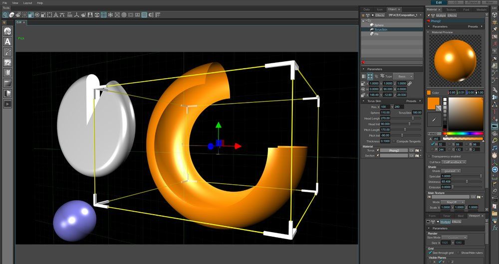 Brainstorm unterstützt eine Vielzahl von Objekten und Primitiven, grundlegende Primitive (Kugel, Kegel, Würfel...), Kurven, Datenbalken, Partikelsysteme und vieles mehr, alle mit mehreren Eigenschaften. Praktisch alle Parameter (Geometrie, Größe, Aussehen, Materialien...) der zahlreichen von Aston unterstützten Objekte und Primitive sind editierbar.