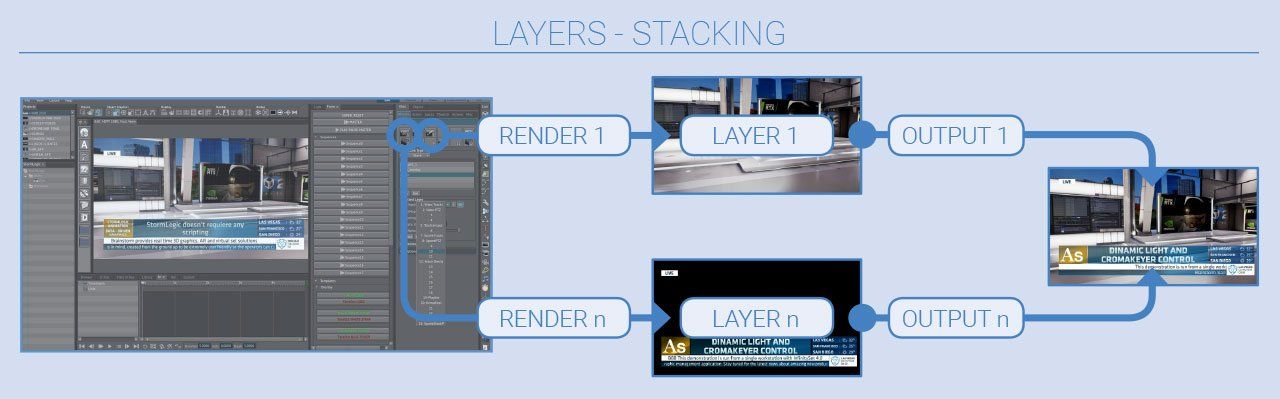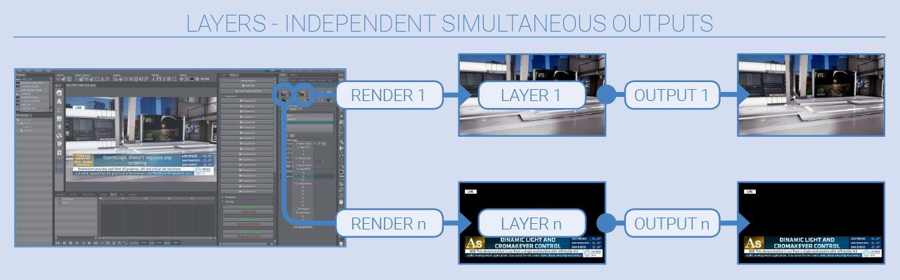 Layer ermöglichen die gleichzeitige Erstellung mehrerer Renderings auf einer einzigen Workstation. Mit Hilfe von Layern kann InfinitySet nun mehrere Videoausgaben von einer einzigen Instanz liefern oder mehrere Koppelpunkte in einer einzigen Videoausgabe (Stack) kombinieren.