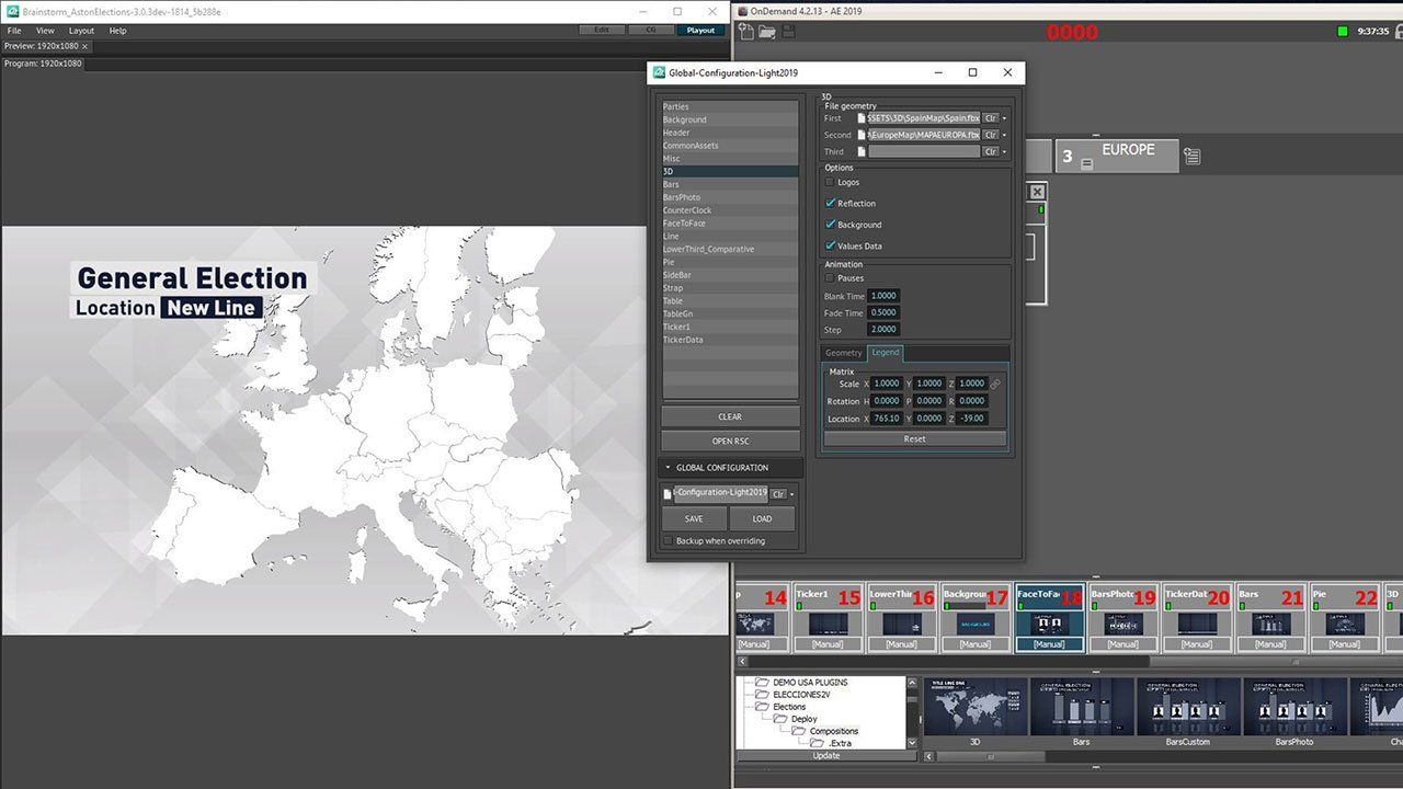 AstonElections verfügt über 20 anpassbare Vorlagen, mit denen Sie Animationen, Farben, Positionen usw. personalisieren können. Natürlich lassen sich auch das Bild der Parteien, Farben und Logos sowie viele andere anpassbare Optionen einfügen. Darüber hinaus kann AstonElections 3D-Karten oder Objekte aus Paketen wie 3DMax oder Cinema4D in einer Vielzahl von Formaten importieren. Die Vorlagen enthalten StormLogic-Animationen, die eine Interaktion zwischen ihnen ermöglichen, und einige von ihnen können im selben Bild koexistieren (z. B. Ticker, Uhr oder Seitenleiste). Und wenn Sie eine bestimmte Vorlage benötigen, sprechen Sie mit uns und wir werden sie für Sie erstellen.