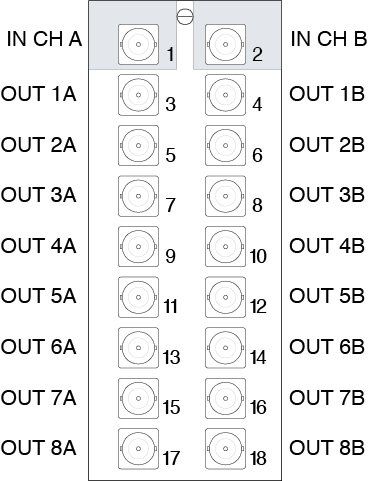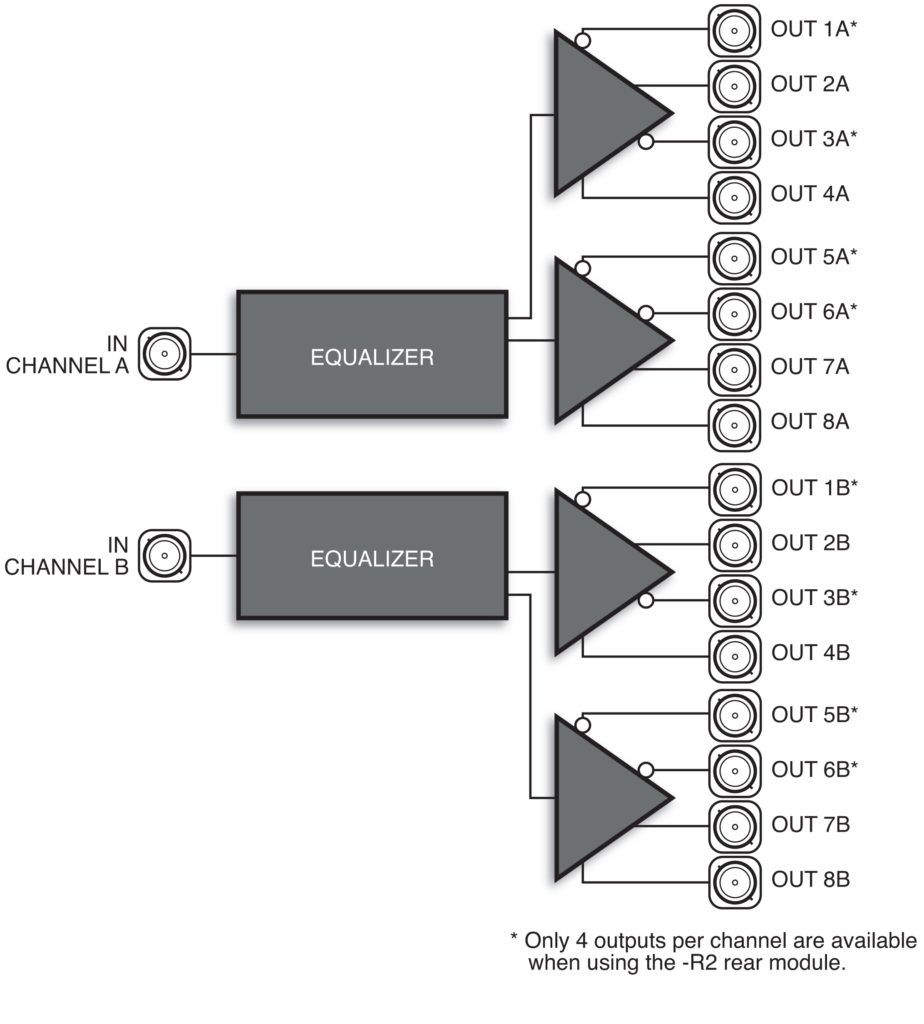 Mit bis zu 8 Ausgängen pro unabhängigem Eingangskanal kann die DEA-8805 in platzbegrenzten Umgebungen als Dual 1×8 DA verwendet werden, wenn sie mit dem -R2H HD-BNC-Rückmodul gepaart wird. Diese Konfiguration ermöglicht bis zu 20 1×8 DAs in einem einzigen openGear®-Rahmen unter Verwendung von 10 Karten. Mit dem standardmäßigen 10 BNC-Rückseitenmodul -R2 arbeitet die DEA-8805 als dualer 1×4-Verteilungsverstärker.