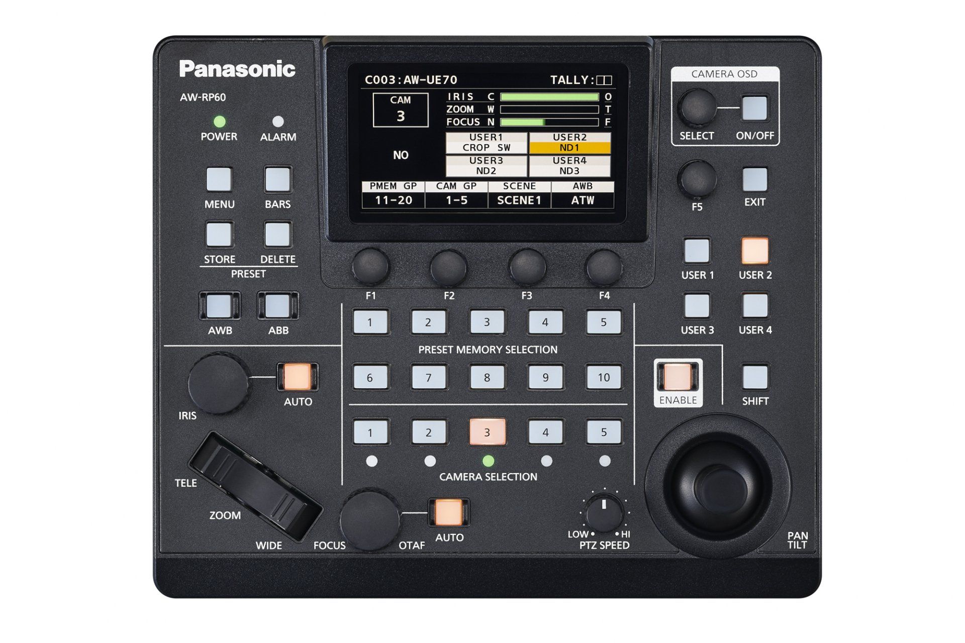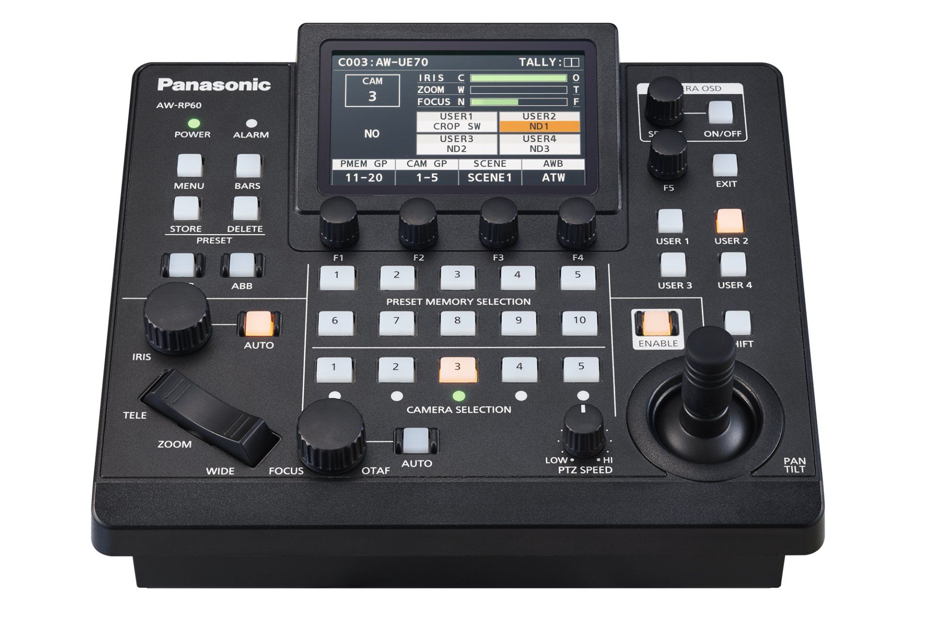 Panasonic stellt die neue Remote-Kamerasteuereinheit AW-RP60 vor: Das große LCD-Display bietet einen gut lesbaren GUI-Menübildschirm, außerdem verfügt die Steuereinheit über einen verbesserten Joystick zur leichteren Steuerung und ist mit allen aktuellen Panasonic PTZ-Modellen kompatibel. Dank verbesserter GUI hat der Benutzer jetzt alle wichtigen Kamerainformationen wie Blende, Zoom und Fokus direkt auf dem Bildschirm immer im Blick. Die AW-RP60 steuert bis zu 200 Kameras in 40 Gruppen, verwaltet 100 Voreinstellungen und vereinfacht die Integration durch PoE-Unterstützung.