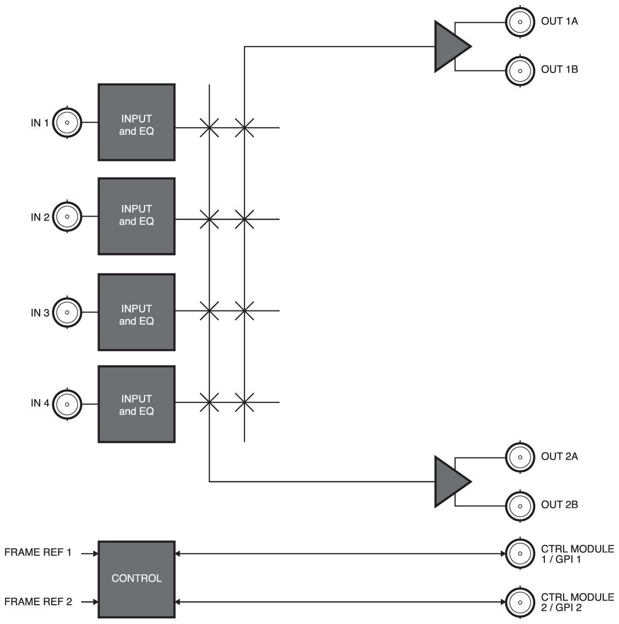 Der AVS-8764 kann als ein Paar unabhängiger 2×1-Schalter oder als ein Paar 4×1-Schalter mit gemeinsamen Eingängen konfiguriert werden. Der AVS-8764 akzeptiert analoges Video oder AES / EBU-Audio mit der Option von unsymmetrisch 75Ω oder symmetrisch 110Ω. Alle Schalter werden im vertikalen Intervall ausgeführt und auf eine externe Referenz getaktet. Jeder Schalter kann lokal an der Kartenkante durch ein optionales Steuermodul RCM-8120 oder durch GPI gesteuert werden. DashBoard und optionale SNMP-Überwachung ist für Eingangsanwesenheit, Referenzanwesenheit und Ausgangsstatus vorgesehen.