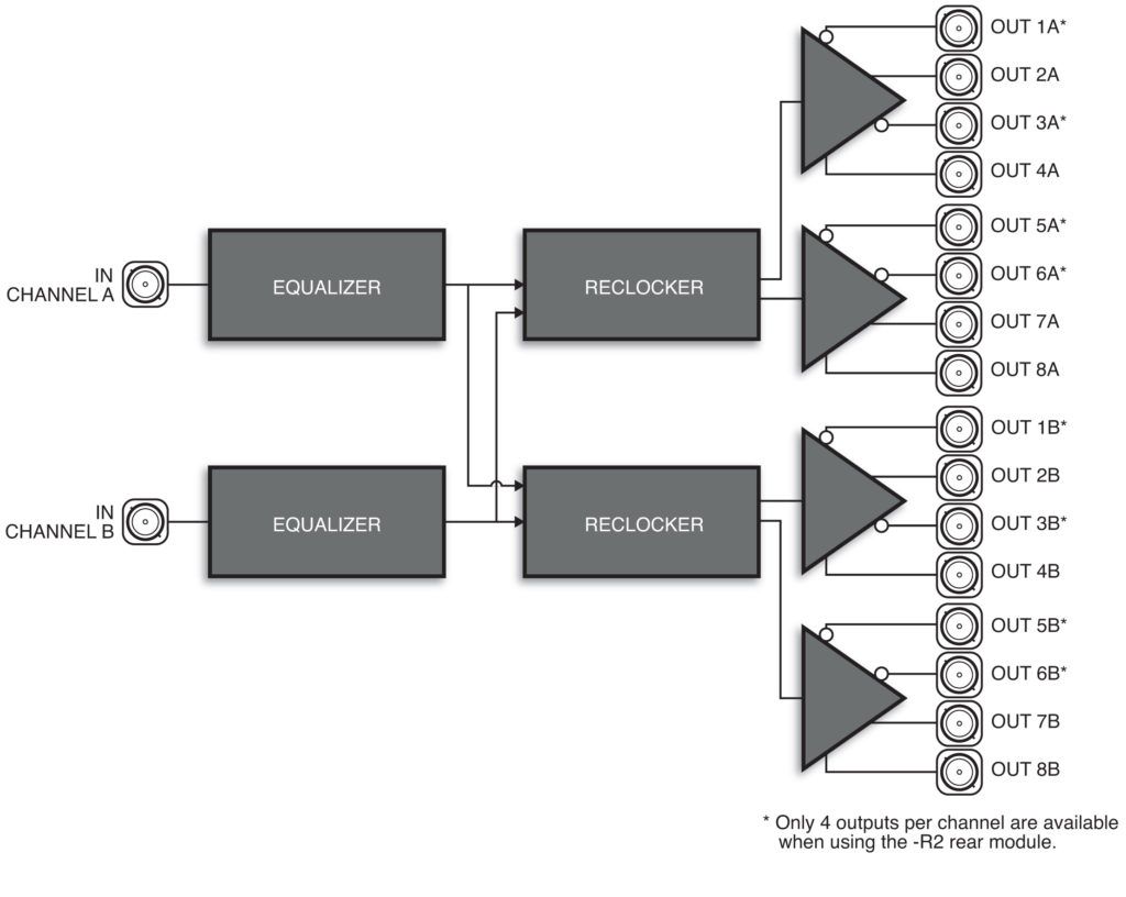 Mit bis zu 8 Ausgängen pro unabhängigem Eingangskanal kann der DRA-8804 in platzbegrenzten Umgebungen als Dual 1×8 DA verwendet werden, wenn er mit dem -R2H HD-BNC-Rückseitenmodul gekoppelt wird. Diese Konfiguration ermöglicht bis zu 20 1×8 DAs in einem einzigen openGear®-Rahmen unter Verwendung von 10 Karten. Mit dem standardmäßigen 10-BNC-Rückseitenmodul -R2 arbeitet der DRA-8804 als dualer 1×4-Verteilungsverstärker, der alle nichtinvertierenden Ausgänge nutzt.