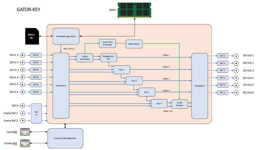 Mit GATOR-KEY bietet Gator 6 konfigurierbare Ausgänge mit Auswahlmöglichkeiten für PGM / PREVIEW und CLEAN. Die vorausschauende PREVIEW ist ideal für Live-Produktionen und bietet Vertrauen in die Qualität und Genauigkeit der nächsten Szene, die ausgestrahlt werden soll.