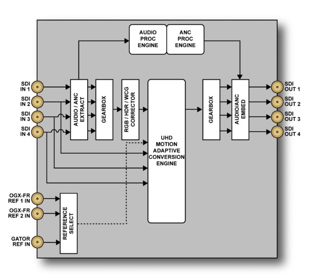 Die Gator Toolbox ist Ihr benutzerfreundlicher und umfassender Problemlöser für die UHD-Signalumwandlung in einem modularen openGear-Formfaktor. Die Gator Toolbox bietet Ihnen ein beruhigendes Gefühl der Sicherheit, indem sie Ihre Signalkonvertierungsanforderungen in Broadcast-, Produktions- und Live-Event-Workflows erfüllt, in denen UHD, HDR und WCG mit niedriger Latenz und hoher Qualität erforderlich sind. Das Herzstück der GATOR-TOOLBOX ist ein hochwertiger, Formatkonverter mit optionaler Bildraten-Standardkonvertierung.