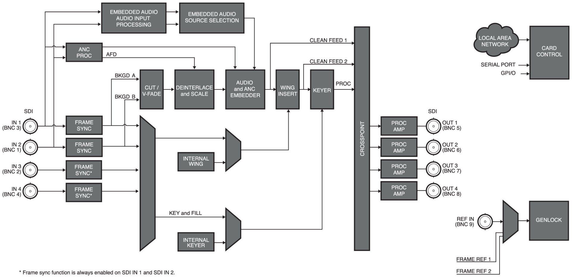 Für das Downstream-Signalmischen bietet der UDC-8625A eine vollständige Audio-/Video-Mixing-Engine, die so konfiguriert werden kann, dass Fade-Fade-, Take-Fade- oder Fade-Take-Übergänge mit wählbarer Rate-Steuerung durchgeführt werden können.