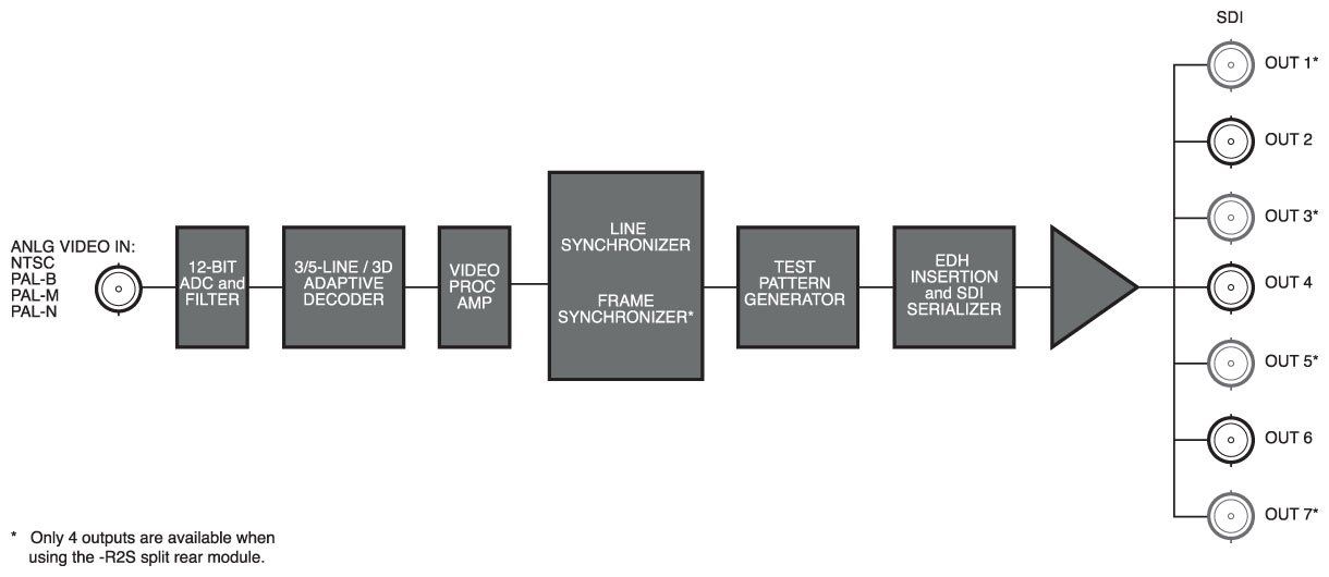 Der ADC-8732B ist ein fortschrittlicher NTSC/PAL-zu-10-Bit-SDI-Videodecoder, der für normale und schwierige analoge Einspeisungen entwickelt wurde. Der adaptive Kammfilter wandelt analoge Einspeisungen in SDI mit viel höherer Detailgenauigkeit und weniger Artefakten um, als dies bei der herkömmlichen 3-Zeilen-Dekodierung der Fall ist. Der ADC-8732B ist standardmäßig mit einem eingebauten Zeilensynchronisierer, einem fortschrittlichen digitalen Proc-Amp und einem Zeitbasiskorrektor zur Dekodierung von nicht zeitbasiskorrigierten Bandmaschinen oder anderen instabilen Signalen ausgestattet.